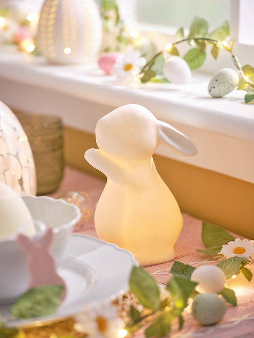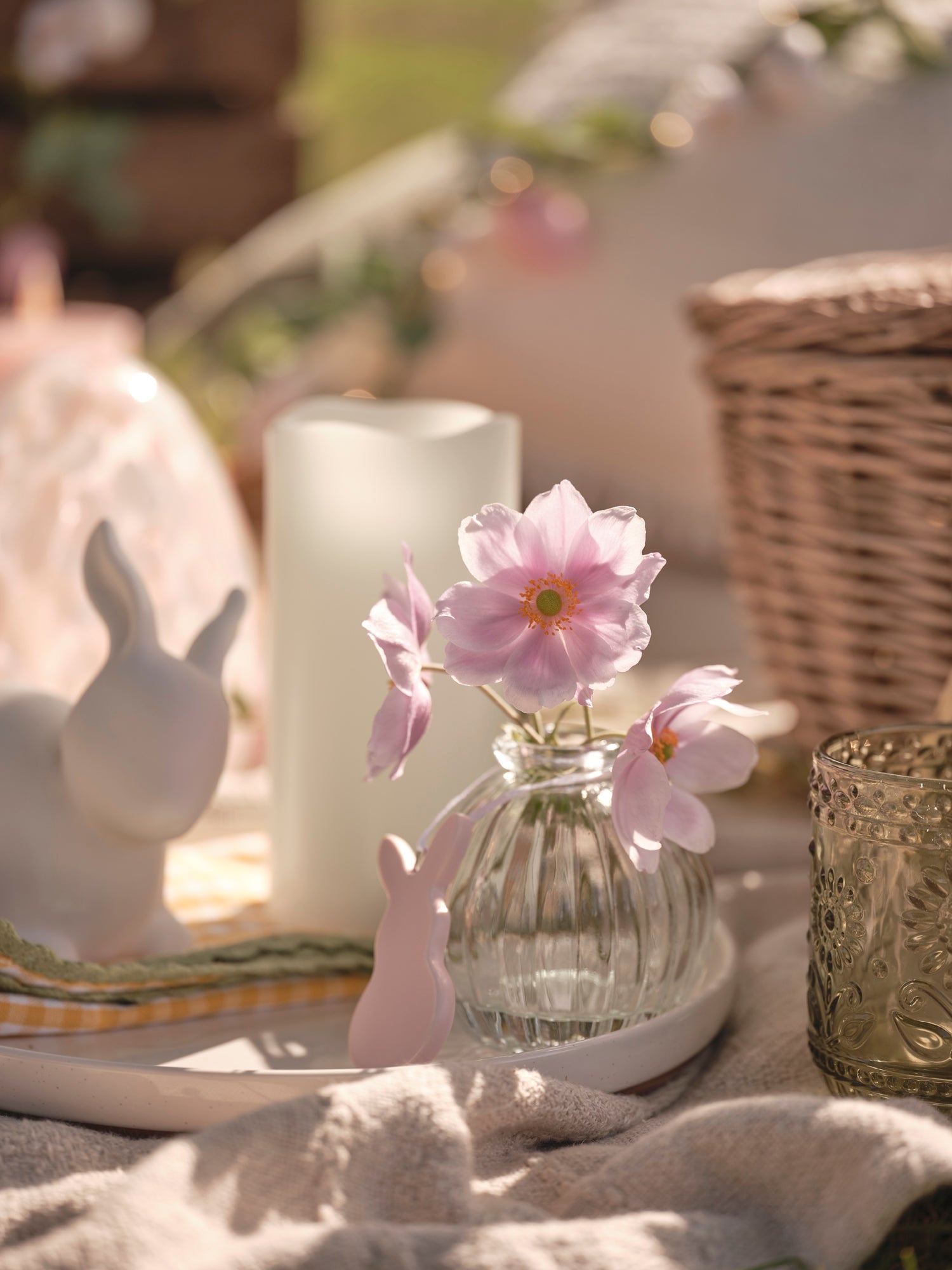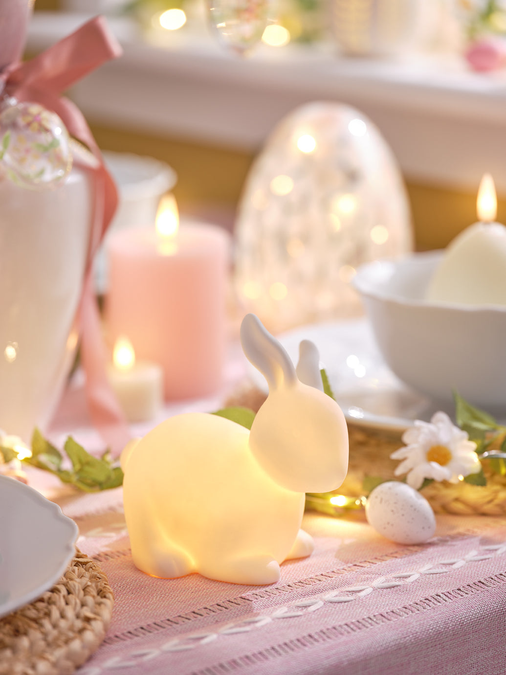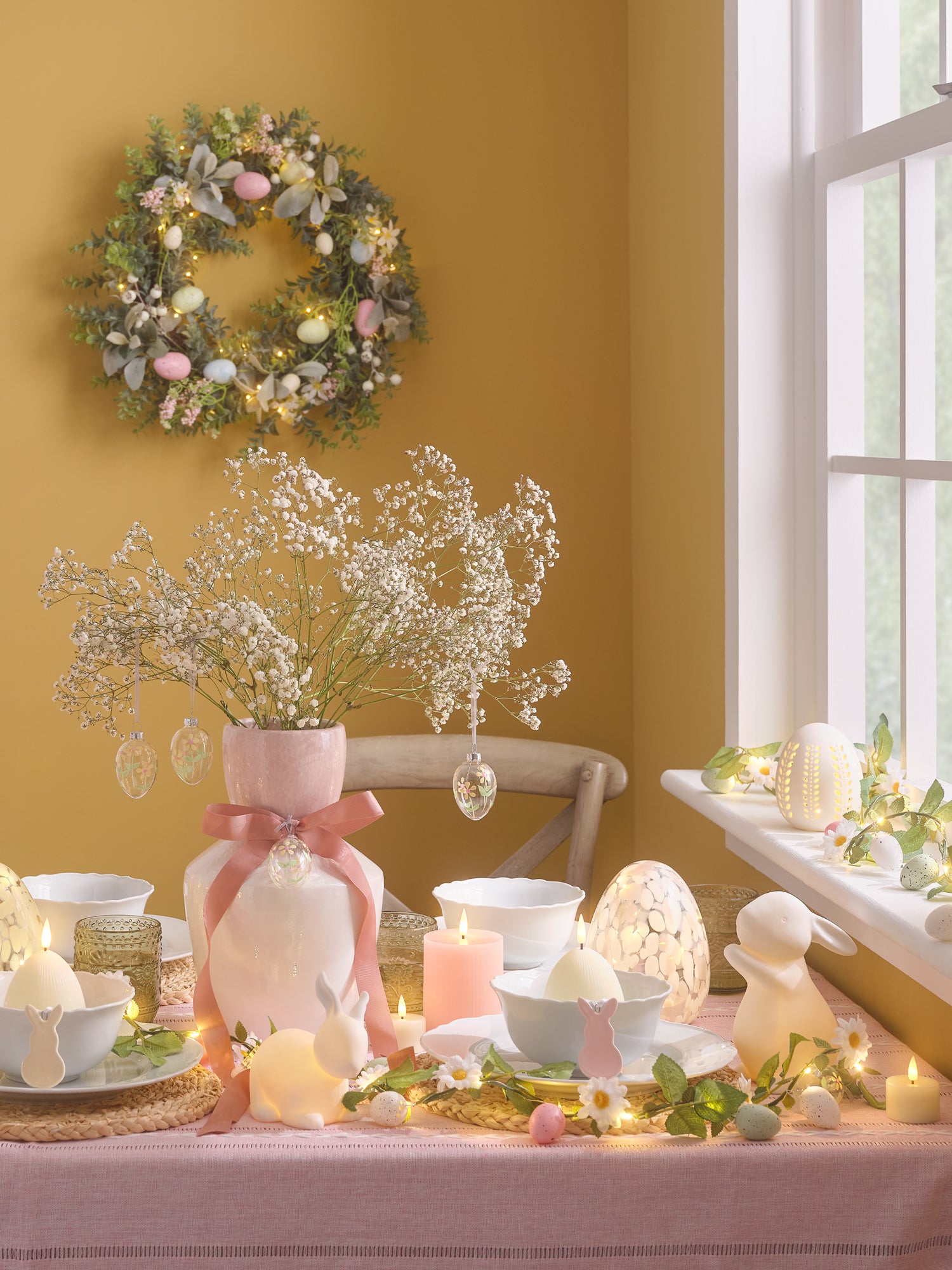 Autour de la table, la décoration devient un véritable décor de saison. Des œufs en verre finement suspendus aux branches décorées apportent de la légèreté, tandis que les guirlandes de lapins rythment l’ensemble avec une note ludique. La lumière douce des bougies enveloppe la scène d’un éclat doré, créant une ambiance chaleureuse et vivante. Une table pensée pour célébrer Pâques avec fraîcheur, élégance et l’élan joyeux du printemps.