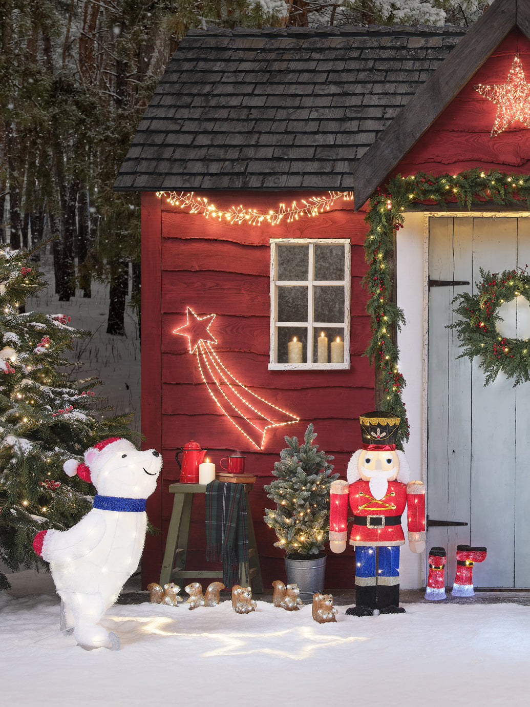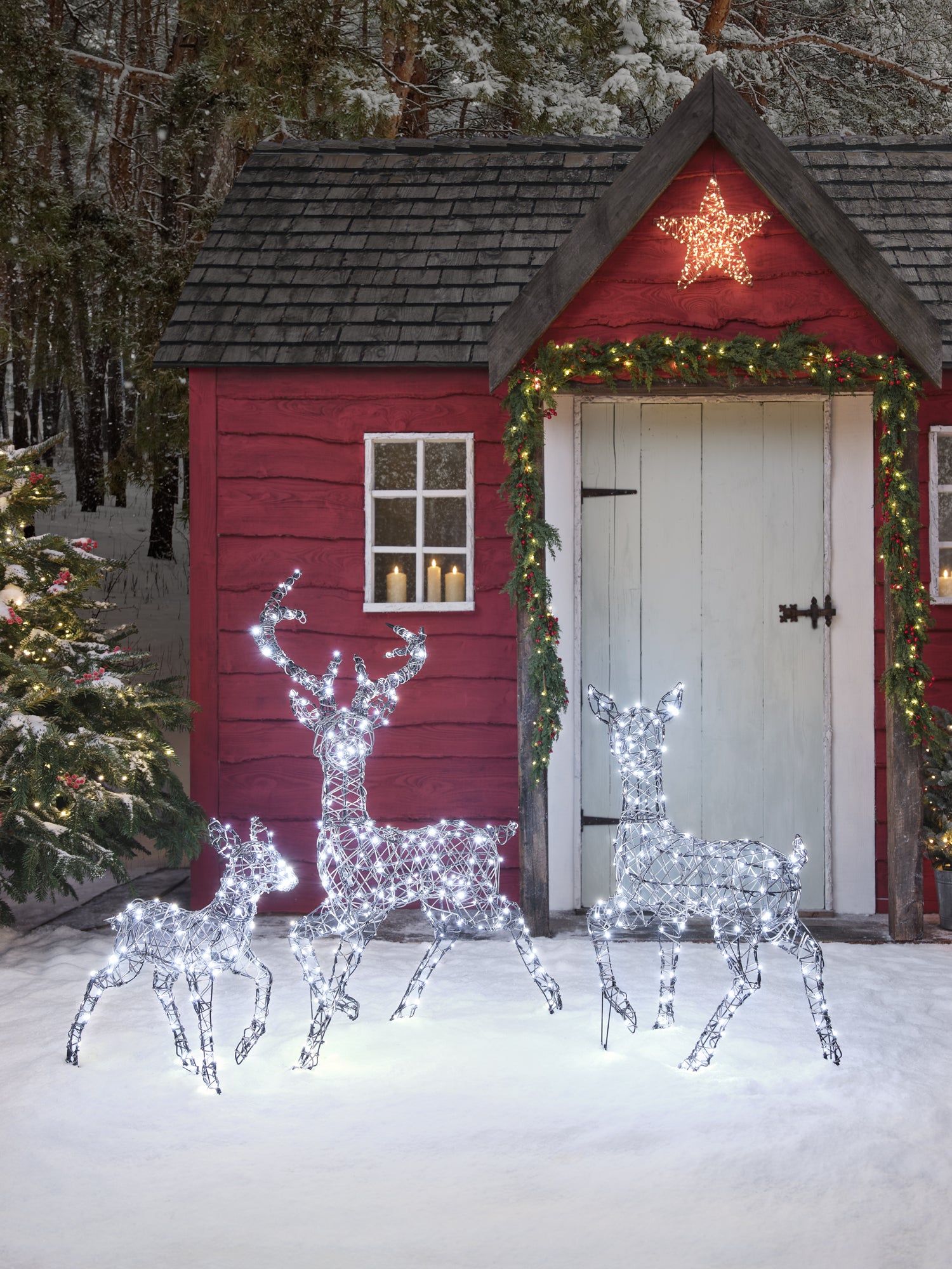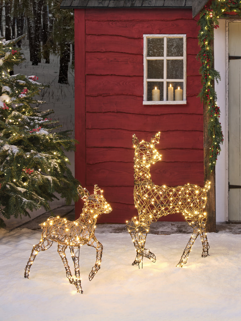 Quand l’hiver s’installe, le jardin se pare de lumière et retrouve tout son charme intemporel. Les guirlandes scintillent sur les branches givrées, les lanternes diffusent une lueur douce et les rennes lumineux apportent une touche d’élégance naturelle, tandis que les couronnes de baies et les rubans en satin ornent les portes. Un décor raffiné, authentique et lumineux, pour célébrer Noël en toute simplicité et avec grâce.