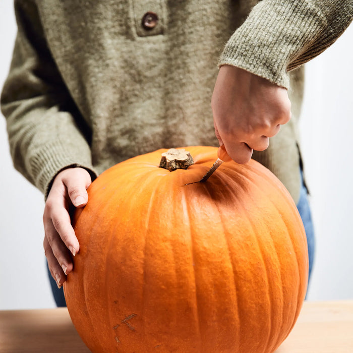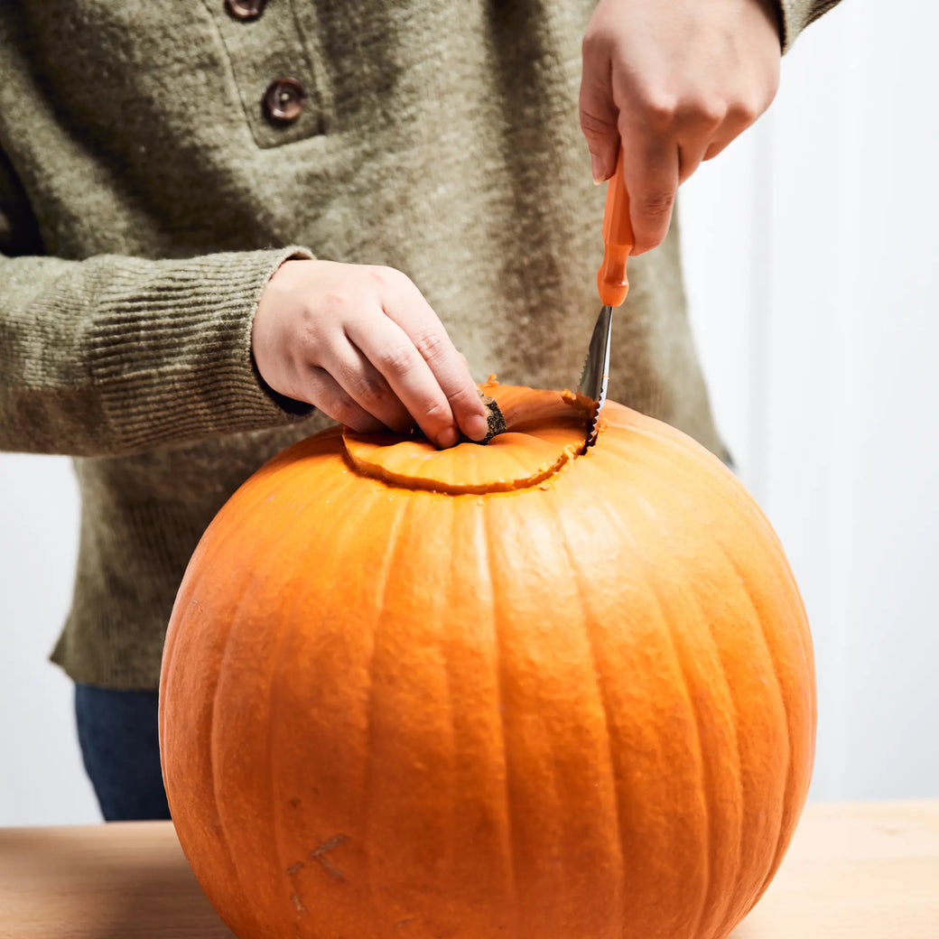 Commencer par placer votre citrouille sur une surface plane, et découper un cercle autour de la tige. Veillez à ce que votre scie crantée soit orientée vers l'intérieur. Cette opération nécessite l'encadrement d'un adulte car elle peut être très délicate et dangereuse !