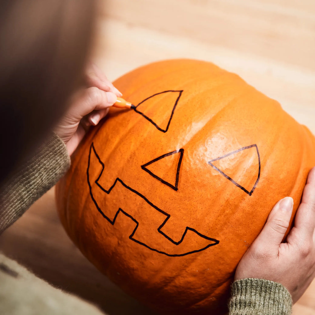 À l'aide d'un marqueur, dessinez le motif que vous souhaitez reproduire sur un côté de la citrouille. N'hésitez pas à laisser libre cours à votre créativité.