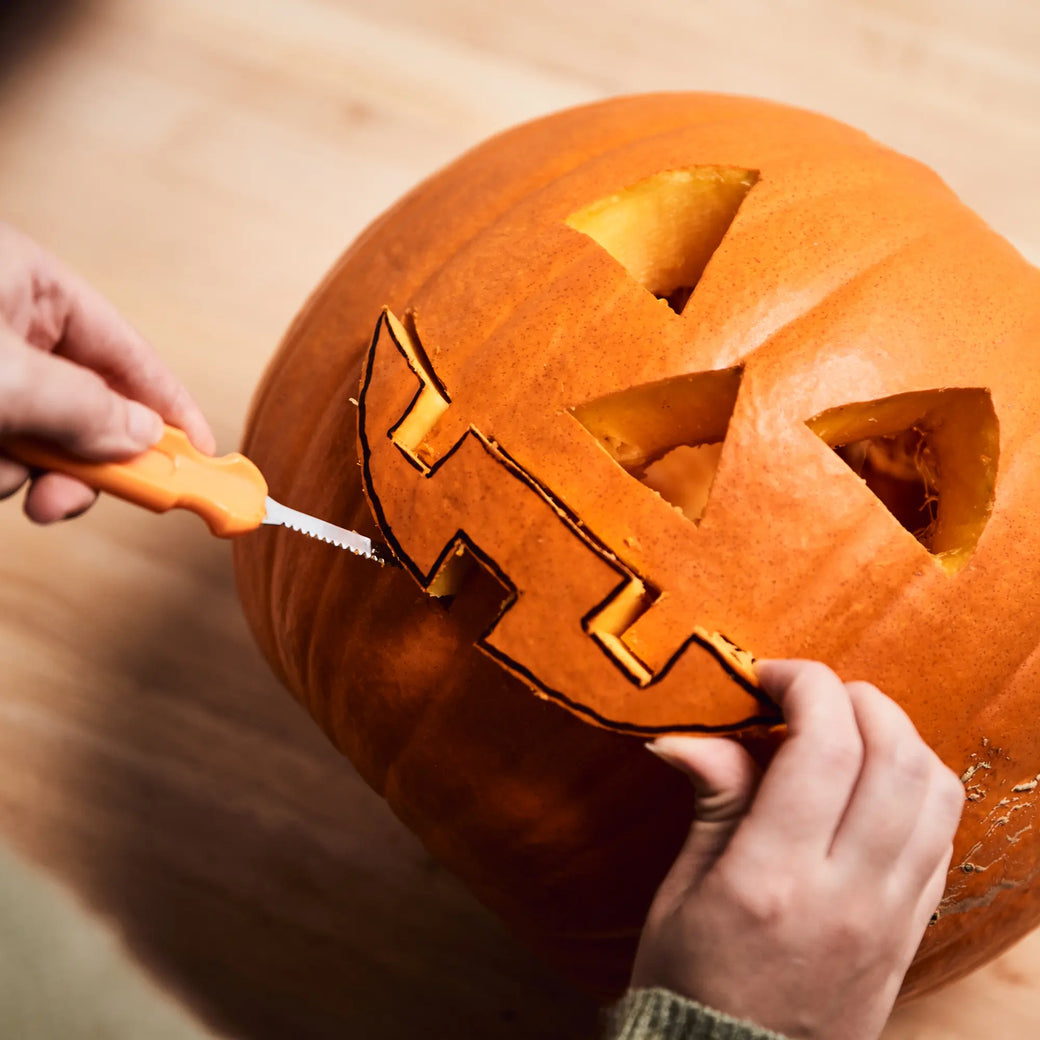 À l'aide d'une scie crantée, découpez la citrouille en suivant le tracé que vous avez dessiné et veillez à ce qu'elle soit entièrement découpée. Une fois la découpe effectuée, retirez les parties découpées pour révéler le résultat final.