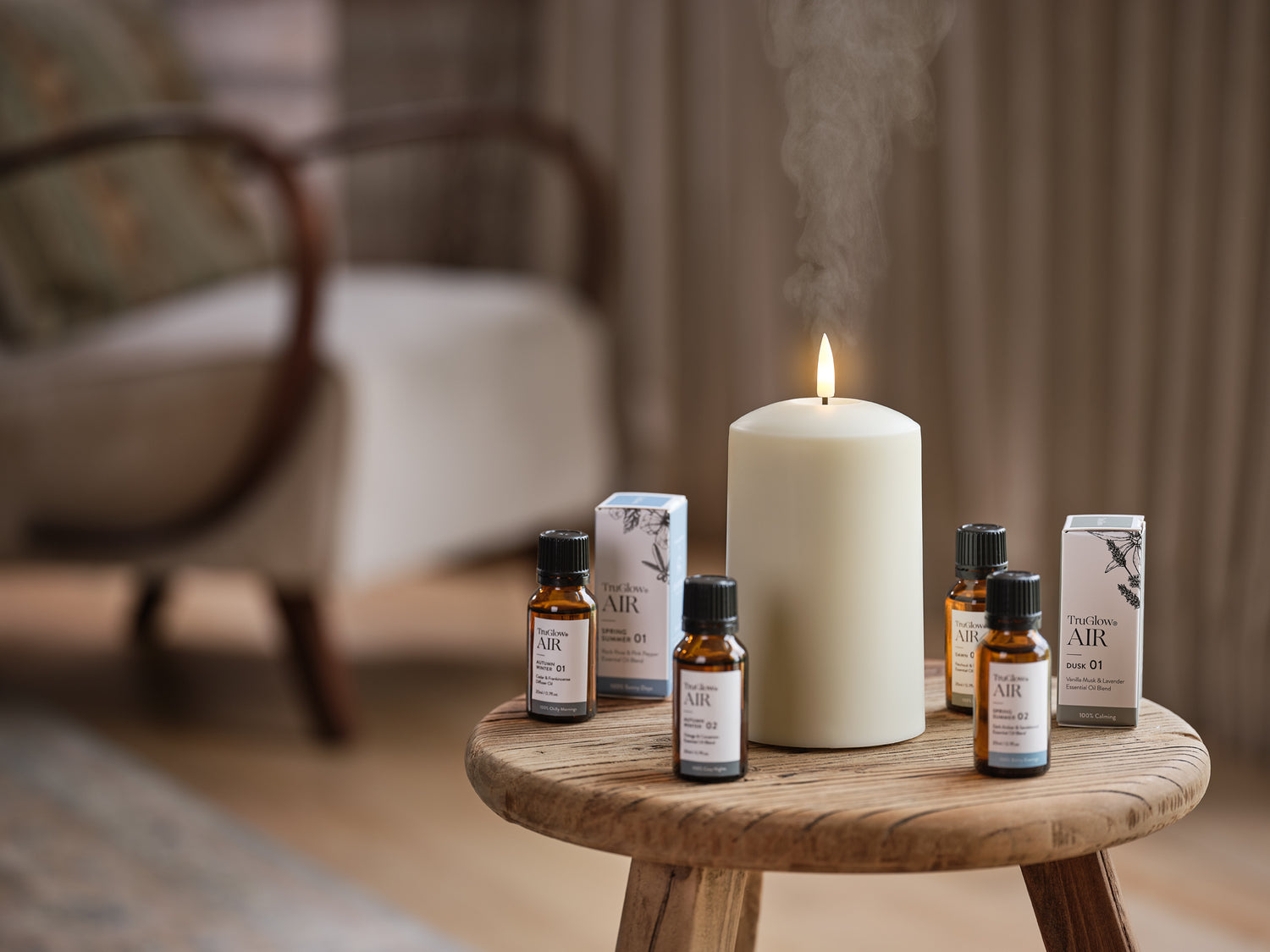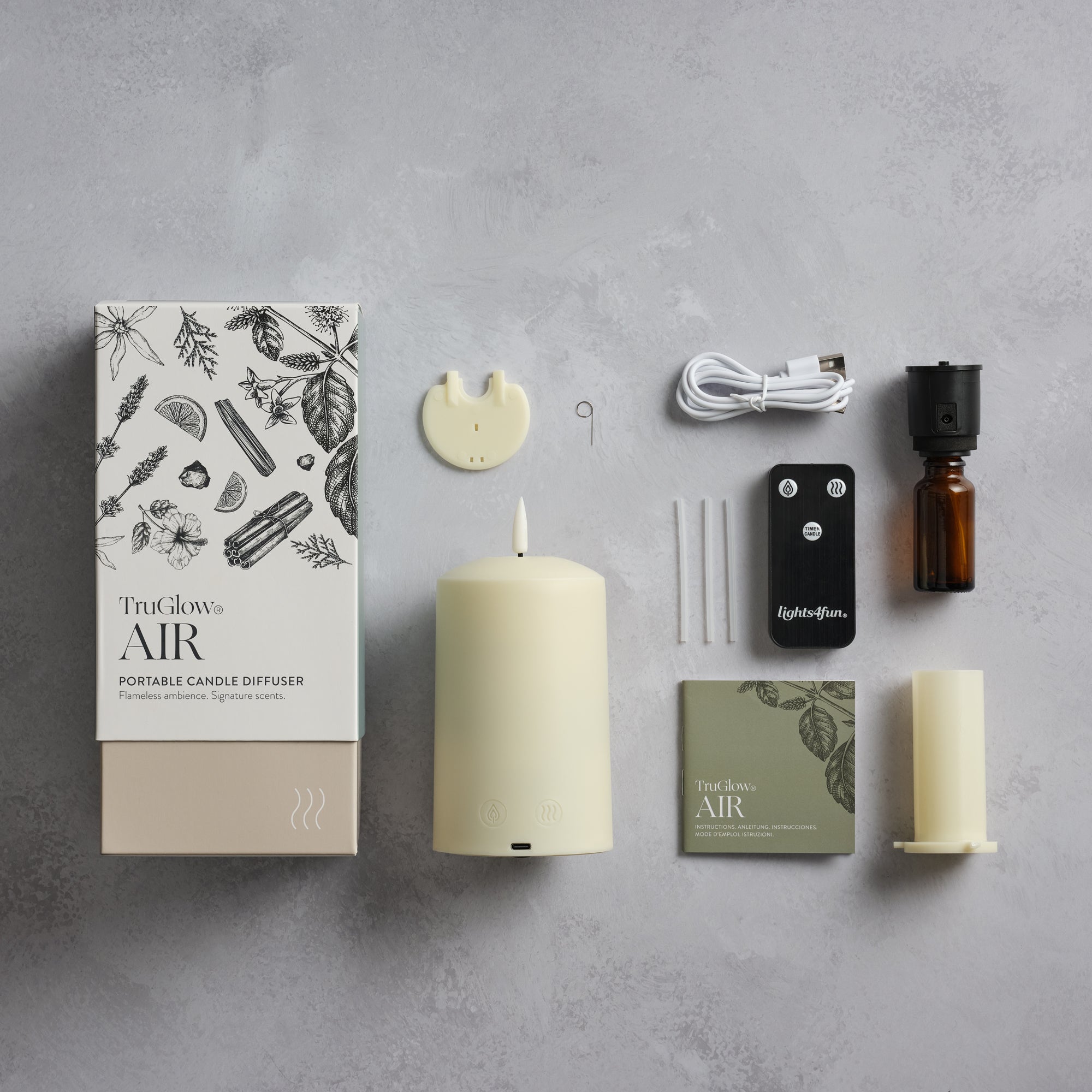 Fruit de deux années de développement minutieux, le design élégant de TruGlow AIR® allie notre technologie de bougies TruGlow®, reconnue pour son réalisme, à un diffuseur de parfum innovant. Le résultat ? Une pièce unique qui sublime votre intérieur, en y ajoutant une touche de raffinement et de sérénité. La bougie ivoire à flamme LED vacillante, peut être utilisée seule ou avec la fonction de diffusion, couvrant 25 à 30 m² et offre jusqu'à une semaine d’autonomie avec une charge de quatre heures via le câble USB fourni.