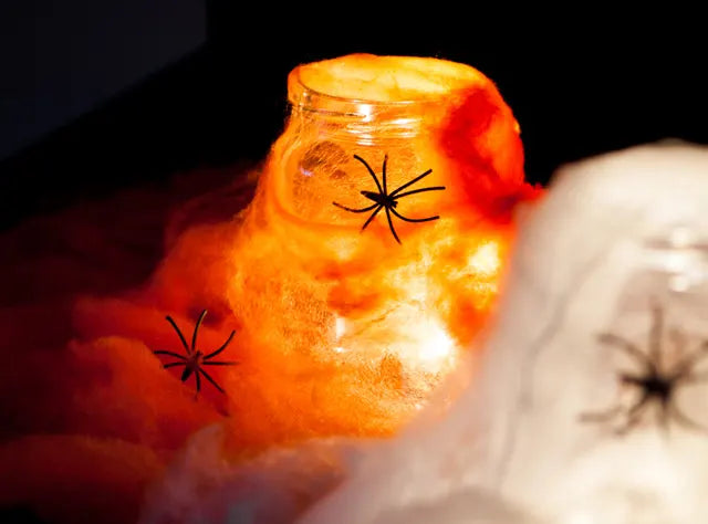 2) Ensuite, commencez à étirer votre toile d’araignée, cette dernière est très malléable donc vous pouvez vraiment faire ressortir votre créativité l’étirant autant que vous le souhaitez. Nous avons opté pour une toile orange et une toile blanche, que nous avons étiré autour des nos bocaux et au long de la table sur laquelle ces derniers sont posés. Assurez-vous que les bougies sont complètement recouvertes par la toile d’araignée.
