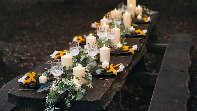 Les dîners en plein air continuent de faire rêver, et même si la météo peut être capricieuse, rien ne remplace l'intimité et la convivialité d'un repas sous un ciel dégagé. Pour une touche d'originalité, misez sur une longue table en bois agrémentée de feuillage artificiel et d'une multitude de bougies LED d'extérieur. Le feuillage apporte une note naturelle et s'adapte à n'importe quel thème, tandis que les bougies diffusent une lumière douce et chaleureuse. Ajoutez-y une couleur dominante pour votre décoration de table, et vous obtenez une atmosphère à la fois rustique et moderne.