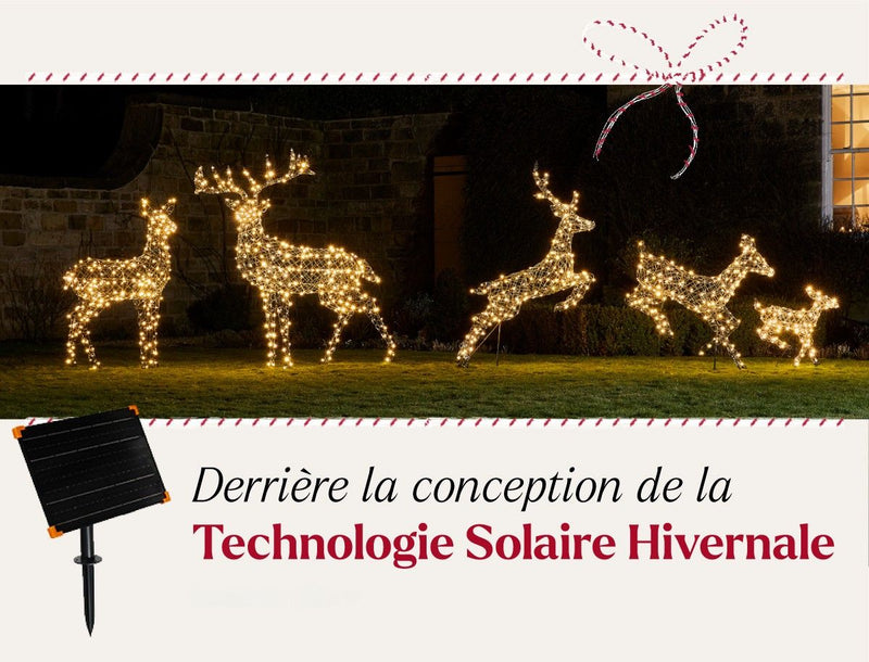 Cette année, place à la lumière durable, même en plein cœur de l’hiver ! Avec notre nouvelle technologie solaire hivernale, il est enfin possible de profiter de décors lumineux spectaculaires sans contrainte. Pensés pour simplifier l’installation des décors extérieurs, ces panneaux permettent d’installer des familles complètes de rennes lumineux partout dans le jardin, sans se soucier des branchements électriques.