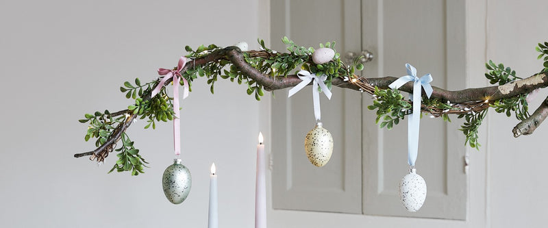 Choisissez des décorations à suspendre pour habiller votre branche, on adore les œufs de Pâques, les lapins ou les poussins ! Optez pour des couleurs pastel pour un look saisonnier classique ou optez pour des motifs ludiques et fantaisistes que toute la famille appréciera. Il vous suffit de passer un ruban à travers chaque crochet et de les attacher à la branche avec un nœud.