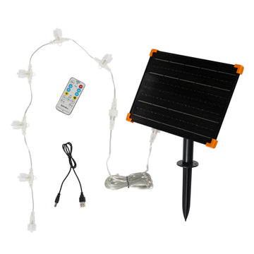 Alimentés par le Panneau Solaire pour Rennes Lumineux de 24V à LED Bicolores avec batterie 1800 mAh, ils comprennent un piquet de sol, un connecteur 5 ports pour rennes 24V et un câble USB pour charge supplémentaire. La télécommande permet d’allumer ou d’éteindre le duo, de choisir la couleur d’éclairage et de programmer la minuterie pour 2, 4, 6 ou 8 heures. Les supports et piquets fournis assurent une fixation stable, tandis que la minuterie de 6 h garantit un allumage automatique chaque soir.